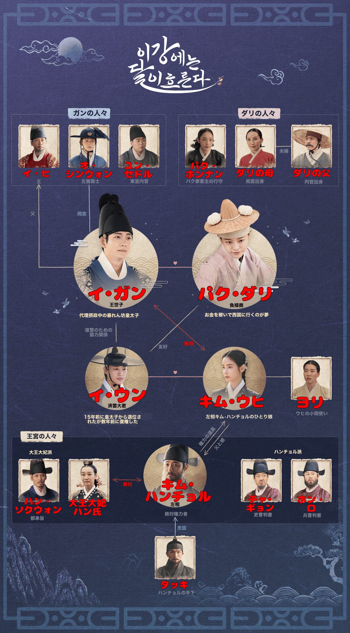 イ・ヒ キム・ナムヒ 朝鮮の王、カンギの父 突然の先王の崩御により王位に就いた。彼は本来、次男であった。先王には息子、それも嫡子が二人いる状況で、彼に王位が巡ってくるはずがなかった。しかし、左相の脅迫にも似た助けにより王となった。主上の左相という、朝鮮において弱く無能で、しかも卑怯な恥知らずな王として生きている。彼の運命に、彼の選択は一つもなかった。全ては左相の意思だった。玉座に就かなければ、左相が犯した全ての悪行を彼に被せるとの脅迫がなければ、王位など欲しがらなかった素朴な男。